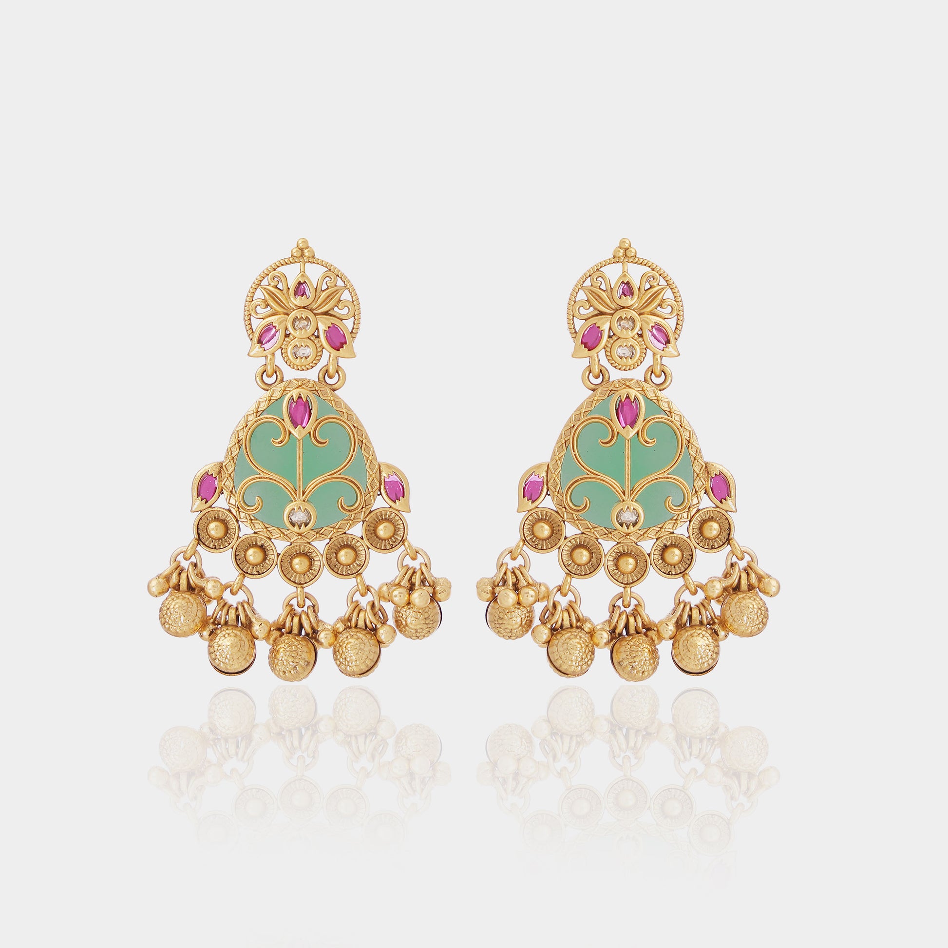 Graceful and finely detailed, Heritage betel leaf shape earrings are crafted to reflect timeless ceremonial beauty. Designed in a lightweight antique gold base and accented with a subtle green stone, this pair blends traditional meenakari artistry with refined elegance.