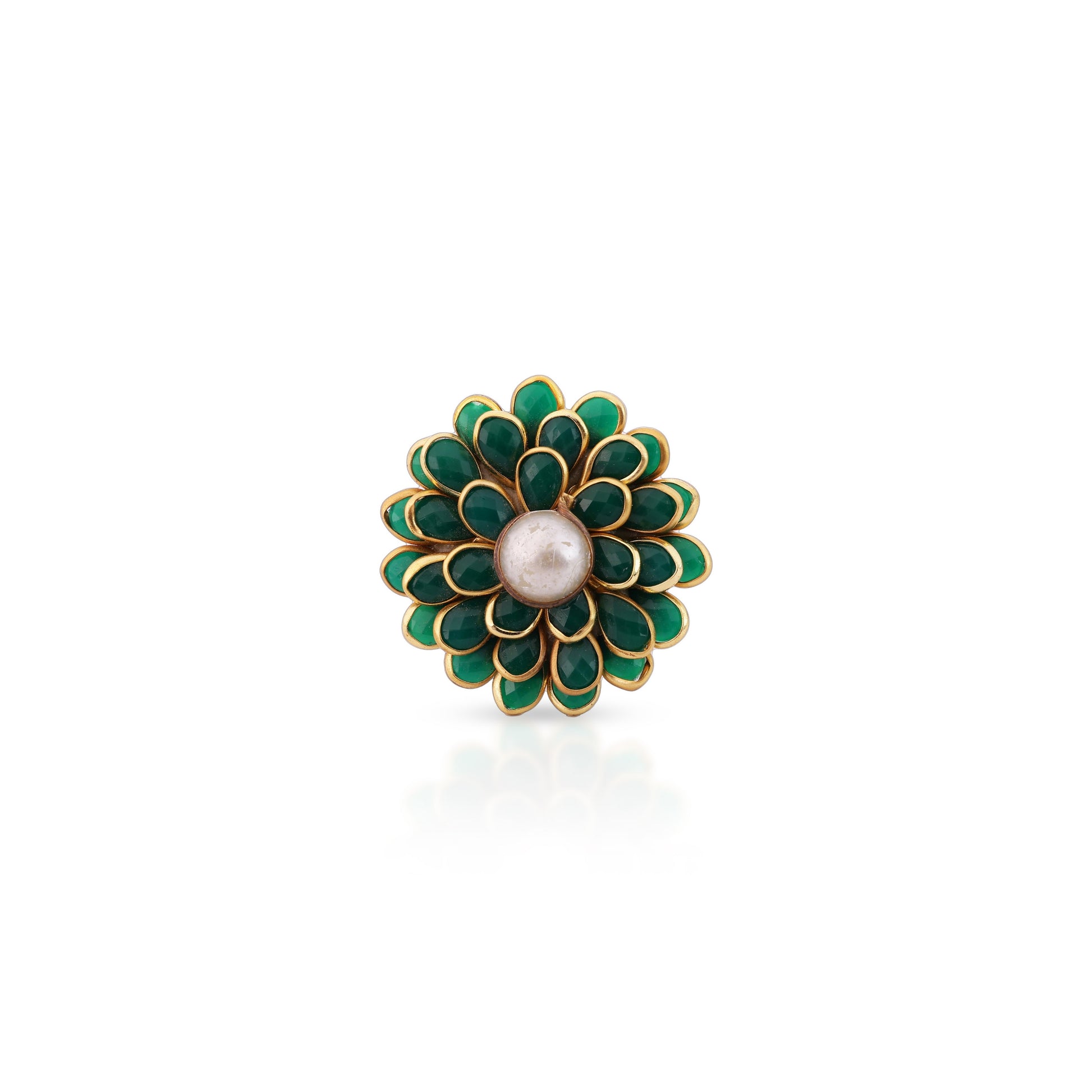 Delicate and charming, Lotus Core Ring with Gem Accents is designed to add a graceful touch to your fashion jewellery collection. Crafted in a rich gold finish, this piece features a lotus-inspired design with a pearl at the centre, enhanced by ruby, emerald, or white bead accents.
