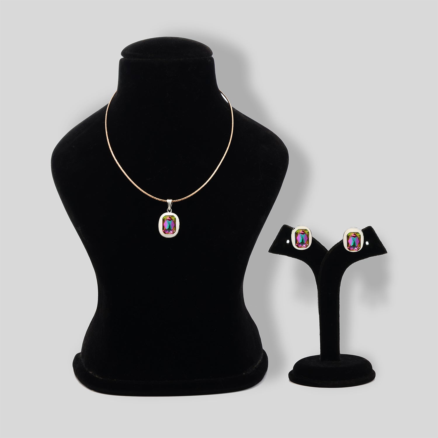 Vibrant and eye-catching, Radiant Spectrum Pendant Set is designed to celebrate colour with contemporary elegance. Featuring a luminous statement pendant paired with coordinated earrings, this set radiates refined sparkle and playful sophistication.