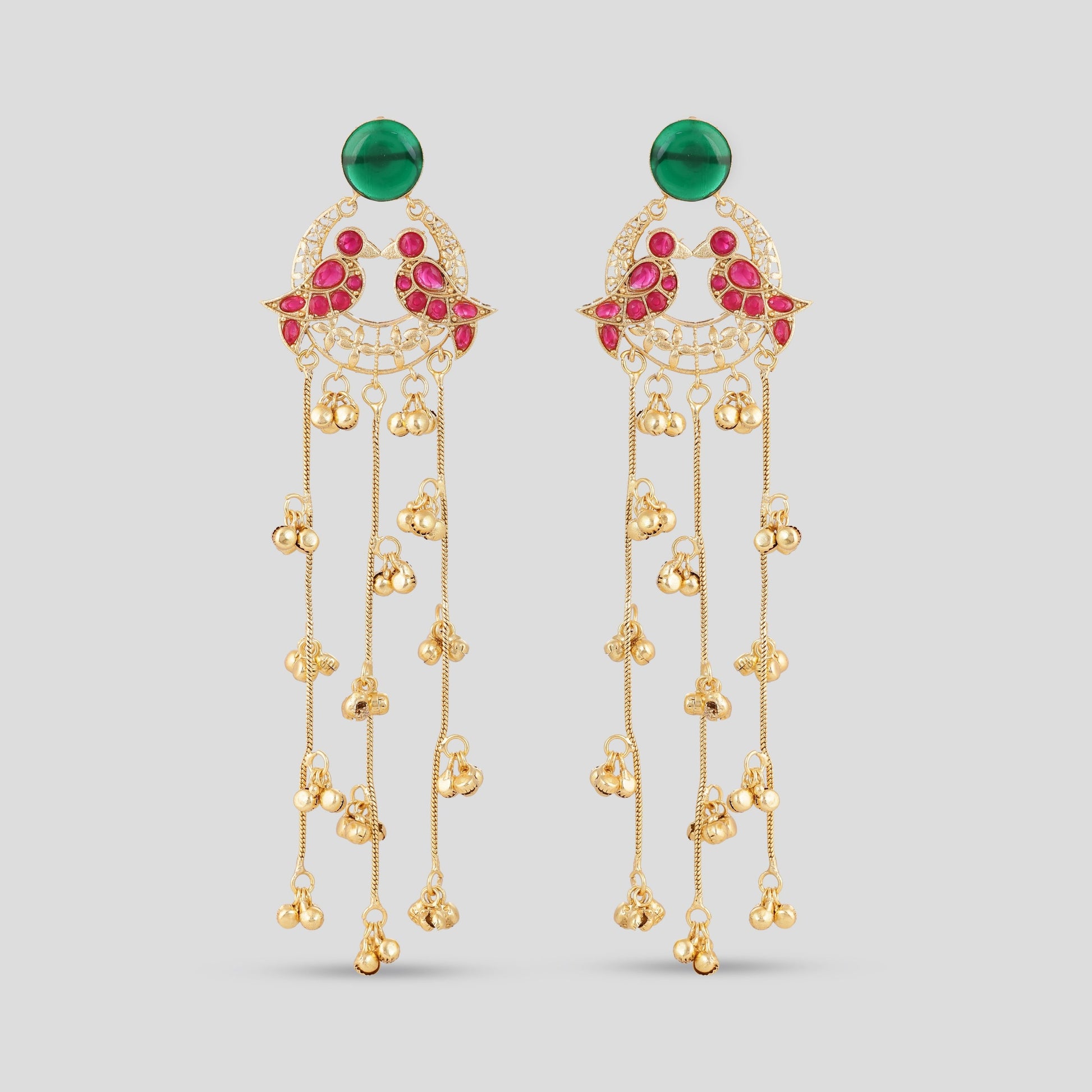 Artistic and traditional, Ruby Bird Motif Kashmiri Drop Earrings are designed to enhance your wedding and festive looks with cultural elegance. Crafted in a rich gold finish, this pair features intricate Kashmiri-inspired detailing highlighted by a unique motif of two birds adorned with ruby stones.