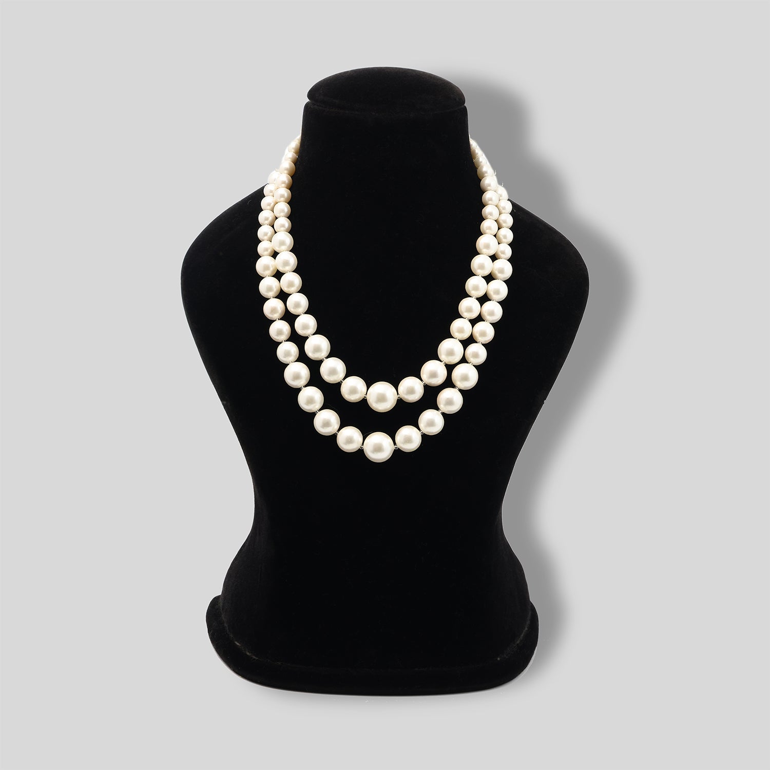 Refined and eternally elegant, Classic Double Pearl Strand Necklace is designed to embody effortless sophistication. Featuring two graceful strands of luminous white pearls, this piece creates a layered silhouette that radiates timeless charm.