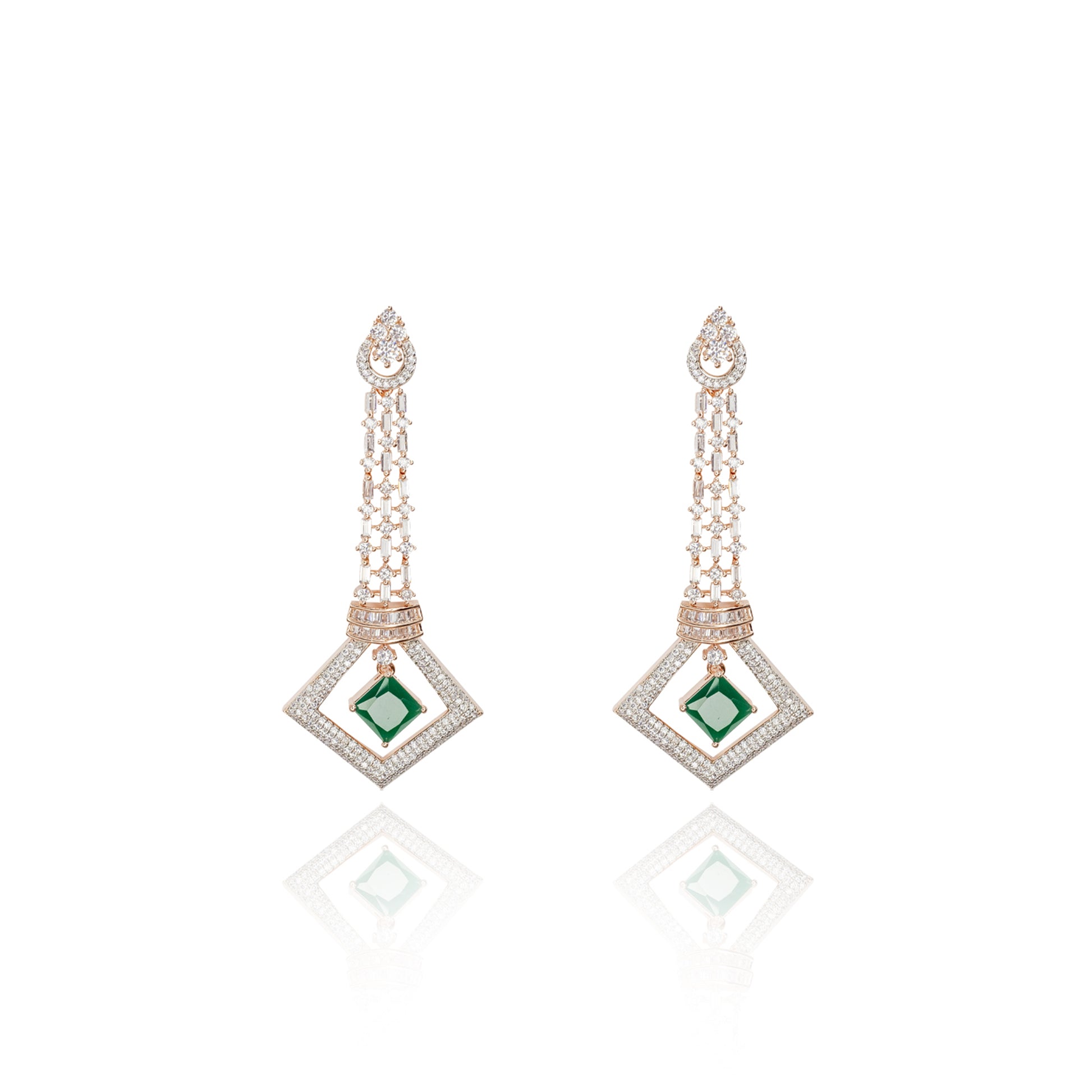 Sleek and captivating, Emerald Pendulum Drop Earrings are designed to move with effortless elegance. Featuring a long pendulum-inspired silhouette adorned with a vivid emerald stone set against warm rose gold tones, this pair radiates refined glamour.