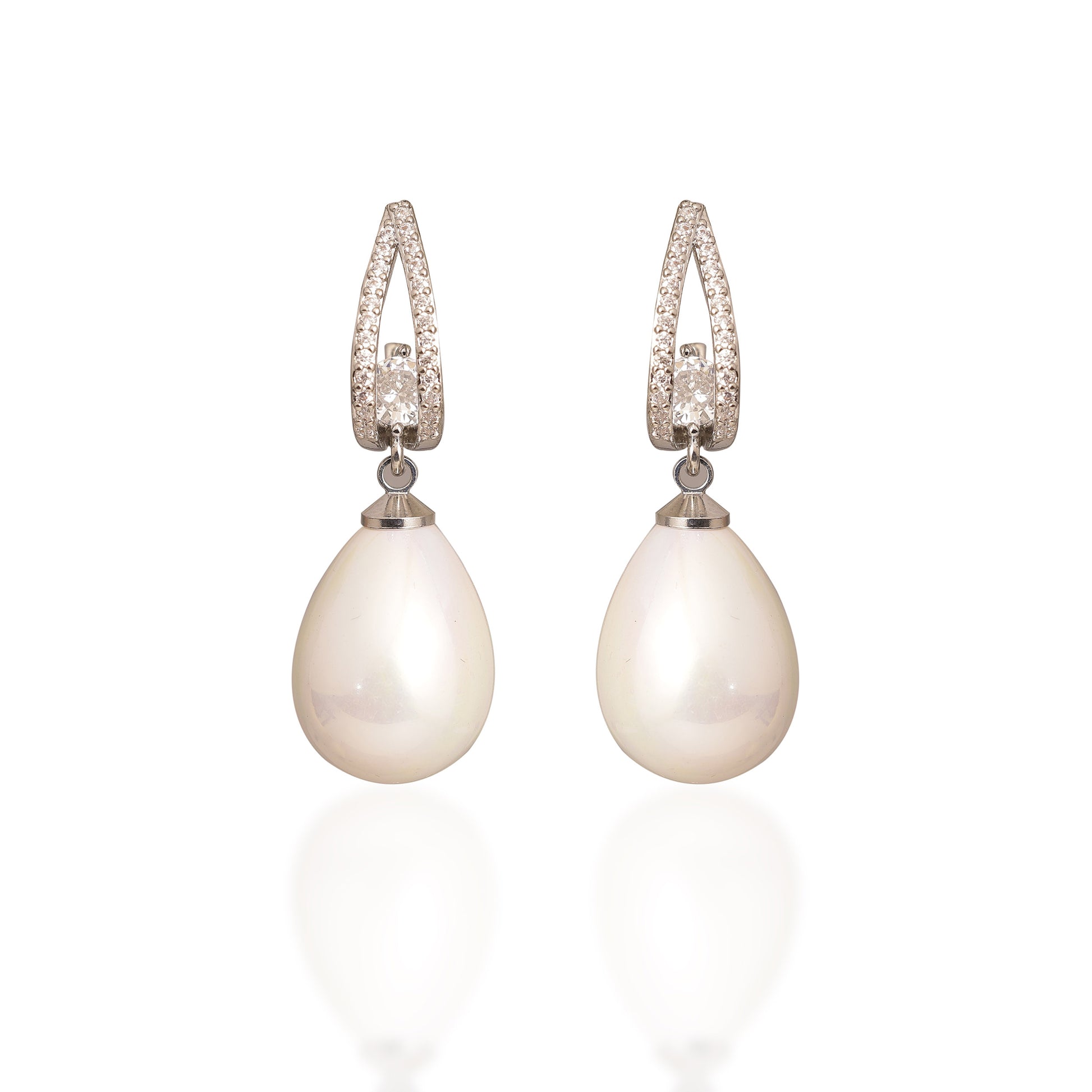 - Design: Diamond-Style Stud with Curved Hang & Pearl Drop